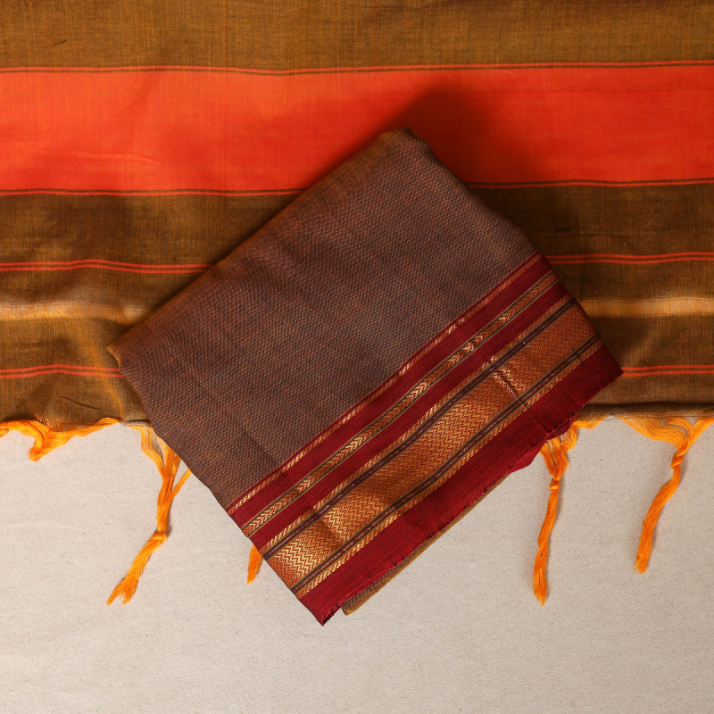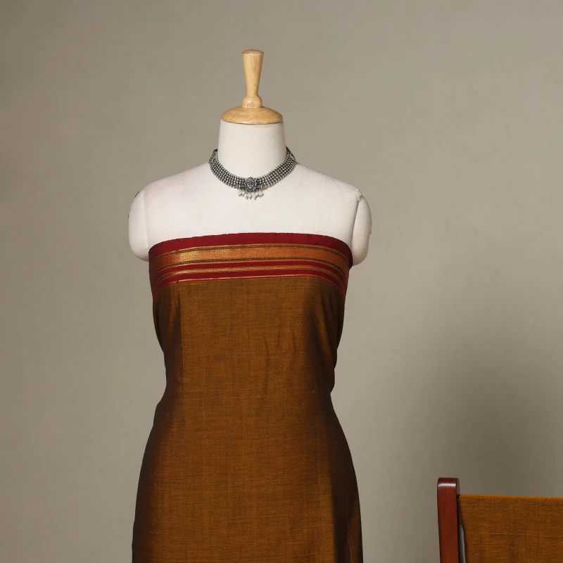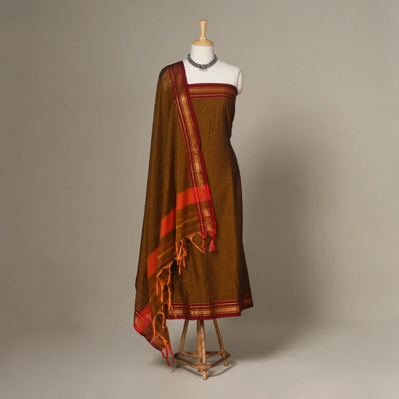 Experience the grace of dharwad with this elegant brown 3pc cotton dress material set. It includes a kurta, bottom, and dupatta, adorned with traditional woven border detailing, a signature of dharwad's timeless weaving heritage from Karnataka. Soft, breathable, and versatile, it's perfect for both festive occasions and everyday elegance.